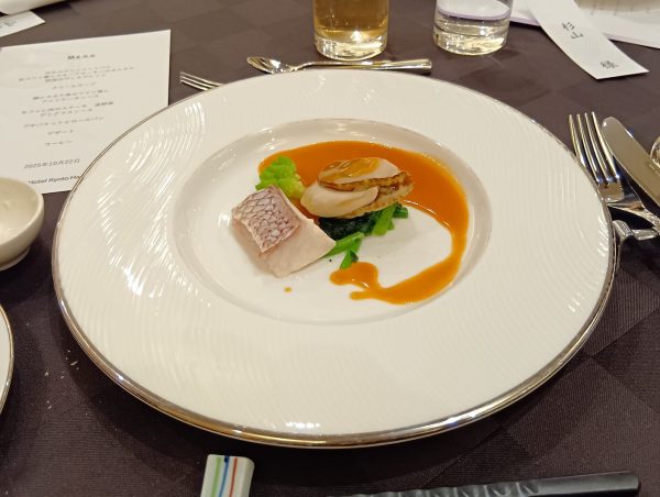 場所は都ホテル京都八条です。なかなか食べることがないフランス料理のコースを味わいながらおいしい時間を過ごしました。